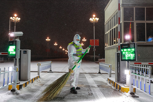 11月6日凌晨,嘉峪關市漫天雪花飛舞,刺骨寒風陣陣,寒潮天氣突然降臨。在疫情防控特殊時期,保衛處職工不畏寒冷堅守崗位,認真執勤、掃雪,保證了疫情防控措施執行到位、職工出入順暢通行。圖為該處職工午夜堅守崗位。張志方 攝